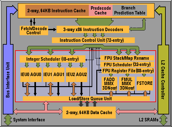 - Multiple Decoders: Three full x86 instruction decoders translate x86 instructions into fixed-length MacroOPs for higher instruction throughput and increased processing power. Instead of executing x86 instructions, which have lengths of 1 to 15 bytes, the Athlon processor executes the fixed-length MacroOPs, while maintaining the instruction coding efficiencies found in x86 programs.