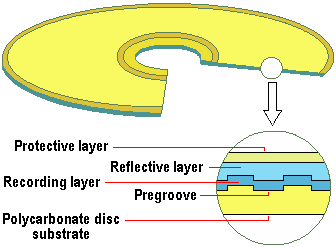 The disc has a spiral track which is preformed during manufacture, onto which data is written during the recording process. This ensures that the recorder follows the same spiral pattern as a conventional CD, and has the same width of 0.6 microns and pitch of 1.6 microns as a conventional disc. Discs are written from the inside of the disc outward. The spiral track makes 22,188 revolutions around the CD, with roughly 600 track revolutions per millimetre.