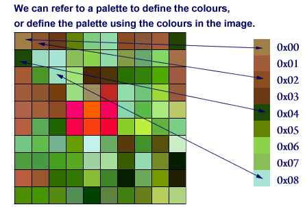 Like a painter, when dealing with images the computer uses a palette. The palette contains the colour information for the picture, and, like the painter’s palette, forms the basis for creating the image. The image data can be developed from one of many existing predefined computer colour palettes, or, as in this example, a palette of colours can be constructed from the colours found in the image, ascribing each colour a numerical value as we go. In this second method, variously called index mapping or colour mapping, the colour map or CLUT (colour look up table) is embedded in the image data itself. GIF images are a common example of an image file type that uses colour mapping.