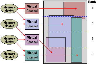 The VCM architecture increases the memory bus efficiency and performance of any DRAM technology by providing a set of fast static registers between the memory core and I/O pins, resulting in reduced data access latency and reduced power consumption. Each data request from a memory master contains separate and unique characteristics. With conventional SDRAM multiple requests from multiple memory masters can cause page trashing and bank conflicts, which result in low memory bus efficiency. The VCM architecture assigns virtual channels to each memory master. Maintaining the individual characteristics of each memory master’s request in this way enables the memory device to be able to read, write and refresh in parallel operations, thus speeding-up data transfer rates.