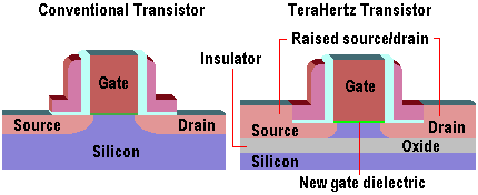Intel’s TeraHertz transistor will contain three major changes. First, the transistors will feature thicker source and drain regions, substructures inside individual transistors that allow electrical current to pass. Second, an ultra-thin silicon insulating layer will be embedded below the source and drain. This is different from conventional silicon-on-insulator (SOI) devices, being fully depleted to create maximum drive current when the transistor is turned on, thereby enabling the transistor to switch on and off faster. The oxide layer also blocks unwanted current flow when the transistor gate is off. Third, the chemical composition of the gate oxide – the layer that connects the transistor gate to the source and drain – will be changed to a new high-k gate dielectric material, grown using a technology called atomic layer deposition, in which growth occurs in layers one molecule thick at a time. The precise chemical composition of the gate oxide has yet to be decided, candidates including oxides from aluminium and titanium, amongst others.