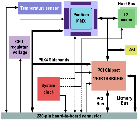 There were various reasons for putting the chip on a module. From an engineering point of view, it made it easier to combat the two main problems which arose in the area around the processor; namely heat and connections. The voltage regulator and the lower voltage of the chip helped dissipate the heat. A temperature sensor was located right by the processor, which triggered whatever heat dissipation method the manufacturer had built in. The 430TX chipset then bridged the gap between the processor and the other components, communicating with a second part of the chipset on the motherboard which controlled the memory bus and other controllers such as the graphics and audio chips.