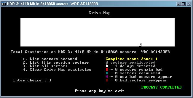 There were four options to choose from after the drive was selected and a DOS based subsystem came up on the screen. Doing a prescan will only detect bad and/or delayed sectors; this takes almost as long as just doing a normal scan, which will then also allow for recovery of the sectors, while that prescan option will not. When finished, all the info with statistics and the like will show up, so you know what has already been done on your computer.