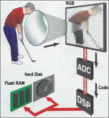 Although the principle may be the same as a film camera, the inner workings of a digital camera are quite different, the imaging being performed either by a charge coupled device (CCD) or CMOS (complementary metal-oxide semiconductor) sensors. Each sensor element converts light into a voltage proportional to the brightness which is passed into an analogue-to-digital converter (ADC) which translates the fluctuations of the CCD into discrete binary code. The digital output of the ADC is sent to a digital signal processor (DSP) which adjusts contrast and detail, and compresses the image before sending it to the storage medium. The brighter the light, the higher the voltage and the brighter the resulting computer pixel. The more elements, the higher the resolution, and the greater the detail that can be captured.