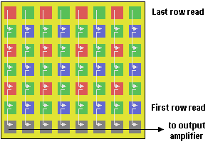 The photosites on a CCD actually respond only to light – not to colour. Colour is added to the image by means of red, green and blue filters placed over each pixel. As the CCD mimics the human eye, the ration of green filters to that of red and blue is two to one. This is because the human eye is most sensitive to yellow-green light. As a pixel can only represent one colour, the true colour is made by averaging the light intensity of the pixels around it – a process known as colour interpolation.