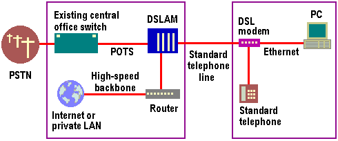 At the user end, the ADSL modem collects high-frequency digital data and assembles it for transmission to the PC or network. At the exchange end, a Digital Subscriber Line Access Multiplexer (DSLAM) connects the ADSL user to the wider Internet, aggregating incoming ADSL lines into a single data connection for transmission onto voice and data networks. The phone signals are sent to the switched telephone network and the digital data routed data to the Internet via a high-speed backbone (implemented as T1, fibre, ATM, or DSL).