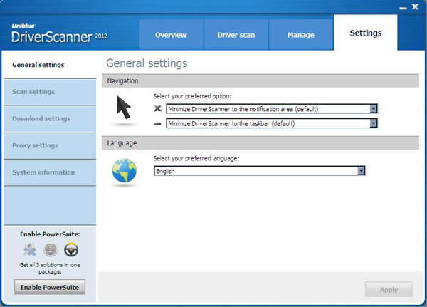 Under the “General Settings” section, the user can choose the active language of Driver Scanner 2012 along with navigation options.