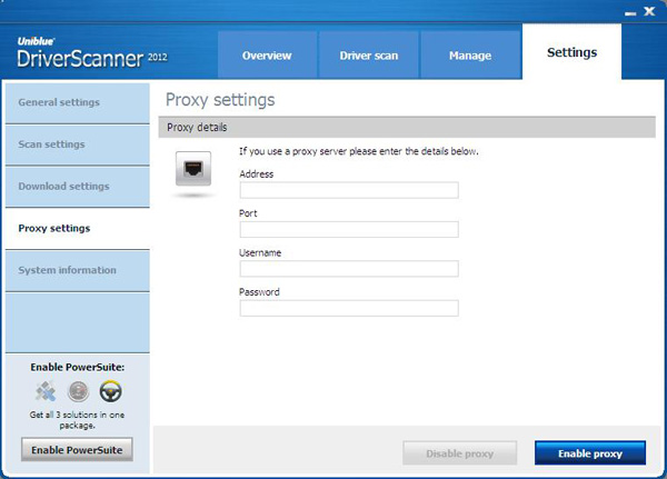If you use a proxy server, Driver Scanner 2012 also allows you to specify what proxy server should be used.