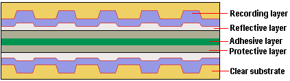 Recording on DVD-R discs is accomplished through the use of a dye recording layer that is permanently transformed by a highly focused red laser beam. This dye substance is spin-coated onto a clear polycarbonate substrate that forms one side of the body of a complete disc. The substrate is injection moulded, and has a microscopic, pre-grooved spiral track formed onto its surface. This groove is used by a DVD-R drive to guide the recording laser beam during the writing process, and also contains recorded information after writing is completed. An undulating wobble signal is moulded into the pre-groove for synchronising a DVD-R drive’s spindle motor during the writing process, and Land Pre-Pits (LPP) are also contained in the land areas between grooves for addressing purposes. A thin layer of metal is then sputtered onto the recording layer so that a reading laser can be reflected off the disc during playback. A protective layer is then applied to the metal surface, which prepares the side for the bonding process.