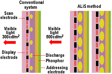 ALiS has the advantage of requiring only half the number of drivers of its predecessor. Because the discharge area for the ALiS method can be wider than in the conventional method, a bigger discharge space and therefore a higher luminance can be obtained. Since the black stripes between screen elements on a standard PDP aren’t present, the image is consequently that much brighter.