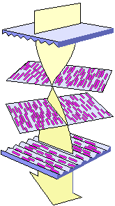 The second principle of an LCD relies on the properties of polarising filters and light itself. Natural light waves are orientated at random angles. A polarising filter is simply a set of incredibly fine parallel lines. These lines act like a net, blocking all light waves apart from those (coincidentally) orientated parallel to the lines. A second polarising filter with lines arranged perpendicular (at 90 degrees) to the first would therefore totally block this already polarised light. Light would only pass through the second polariser if its lines were exactly parallel with the first, or if the light itself had been twisted to match the second polariser.