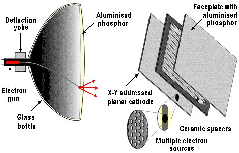 US-based Candescent Technologies calls its implementation of FED technology ThinCRTs. The technology works on the same principles as standard picture tubes used by desktop computers and televisions. Beams of electrons are fired from negatively-charged electrodes (cathodes) through an evacuated glass tube. The electrons strike phosphors at the front of the tube, causing them to glow and create a high-resolution picture.