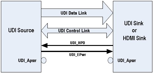 The control link also includes an additional support signal, UDI_HPD, and two power lines, UDI_EPwr and UDI_APwr. The UDI_HPD signal indicates to a UDI Source that a Sink is present and provides a mechanism for the Sink to signal events to the Source. The UDI_EPwr signal provides minimal power from the Source to the Sink for reading Sink capabilities on embedded links and for compatibility with HDMI sinks on external links. On external connectors, an additional higher level of auxiliary power is provided on the UDI_APwr pin to supply operational power to an external device such as a repeater.