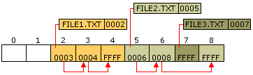 The FAT contains an entry for every file stored on the volume that contains the address of the file’s starting cluster. Each cluster contains a pointer to the next cluster in the file, or an end-of-file indicator at (0xFFFF), which indicates that this cluster is the end of the file. The diagram shows three files: File1.txt uses three clusters, File2.txt is a fragmented file that requires three clusters and File3.txt fits in one cluster. In each case, the file allocation table entry points to the first cluster of the file.