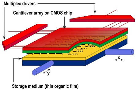 High data rates can be achieved by parallel operation of a large number of tiny tips in a small area. IBM scientists believe their technique will eventually allow storage densities of up to 500 gigabits per square inch (80 Gbit/cm2). That’s five to ten times the presumed upper limit for magnetic storage.