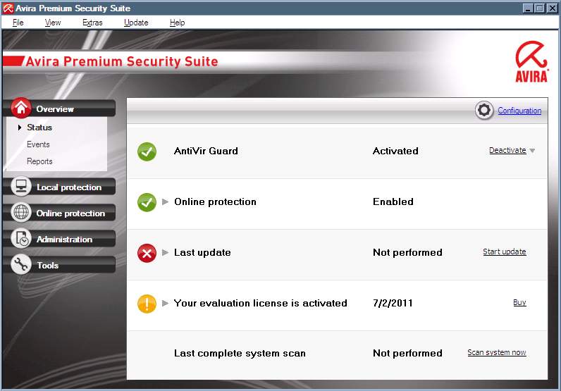 After installing and starting Avira Premium Security Suite, the user is presented with the home screen detailing which actions should be performed and how to go about doing them. The first and most important was to make sure that the latest updates were installed.