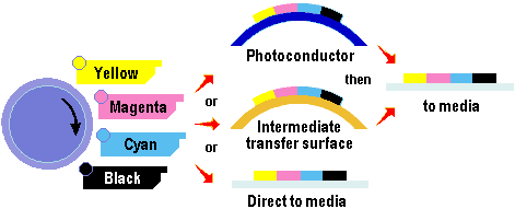 Laser printers are usually monochrome devices, but as with most mono technologies, laser printing can be adapted to colour. It does this by using cyan, magenta and yellow in combination to produce the different printable colours. Four passes through the electro-photographic process are performed, generally placing toners on the page one at a time or building up the four-colour image on an intermediate transfer surface.