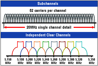 COFDM was developed specifically for indoor wireless use and offers performance much superior to that of spread-spectrum solutions. COFDM works by breaking one high-speed data carrier into several lower-speed subcarriers, which are then transmitted in parallel. Each high-speed carrier is 20MHz wide and is broken up into 52 subchannels, each approximately 300KHz wide. COFDM uses 48 of these subchannels for data, while the remaining four are used for error correction. COFDM delivers higher data rates and a high degree of multipath reflection recovery, thanks to its encoding scheme and error correction.