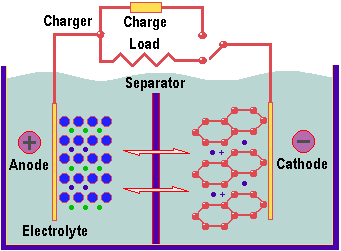 The main ingredient of an Li-Ion battery is lithium – not as the pure lithium metal, but in the form of atoms within the graphite forming the battery’s anode (positive terminal), as lithium-cobalt oxide or lithium-mangan oxide in the cathode (negative terminal) and as lithium salt in the battery’s electrolyte. It relies on reversible action. When being charged, some of the lithium ions usually stored in the cathode are released and make their way to the graphite (carbon) anode., where they combine into its crystalline structure. When connected to a load – such as a notebook PC – the electrochemical imbalance within the battery created by the charging process is reversed, delivering a current to the load.