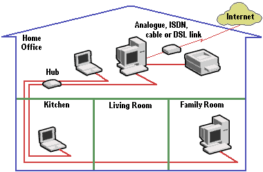 The figure shows how an Ethernet network could be set up in the home. Internal or external network adapters are installed in each PC. Peripheral devices without direct Ethernet connection options – such as printers – are shared through a networked PC. Each PC is then connected to the Ethernet hub over Category 3 or Category 5 cabling. The hub manages the communication between the devices on the network. A single 56 Kbit/s analogue, ISDN, cable or DSL modem provides a shared Internet connection.