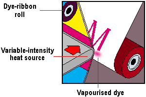 The printing process used by true dye-sublimation printers differs from that of inkjets. Instead of spraying jets of ink onto a page as inkjet printers do, dye-sublimation printers apply a dye from a plastic film. This takes the form of a either a roll or a ribbon, similar to that used by thermal wax printers, usually containing consecutive panels of cyan, magenta, yellow and black dye.