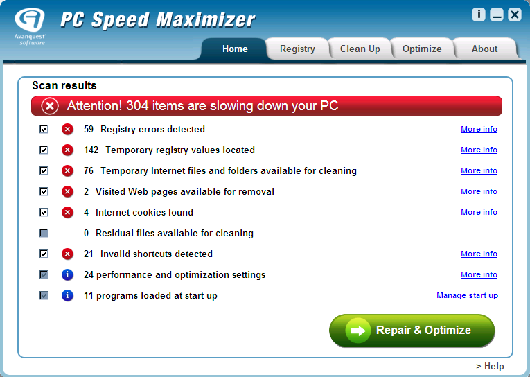 PC Speed Maximizer finds invalid registry entries, system settings and old, unused, and obsolete files on your system and deletes them, enabling your system to run more efficiently.