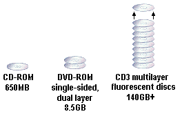 - FMD (Fluorescent Multi-layer disc) ROM: Depending on the application and the market requirements, the first generation of 120mm FMD ROM discs will hold between 20 and 100GB of pre-recorded data on 12 to 30 data layers – sufficient to store up to 20 hours of compressed HDTV film viewing – with a total thickness of under 2mm