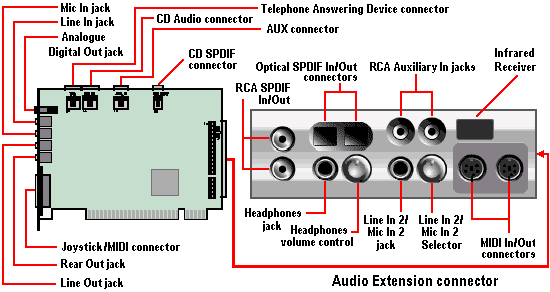 - Analogue/Digital Out jack: 6-channel or compressed Dolby AC-3 SPDIF output for connection to external digital devices or digital speaker systems; also supports centre and subwoofer analogue channels for connection to 5.1 analogue speaker systems